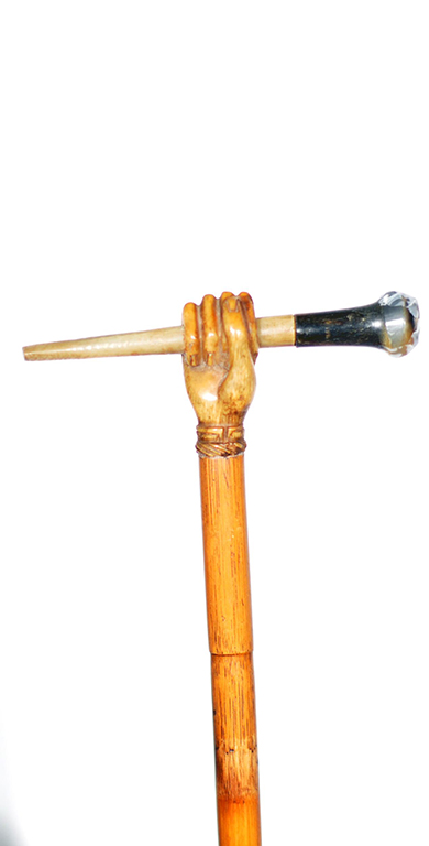 Canna di bambù ed impugnatura in corno raffigurante una mano che stringe un bocchino effettivamente utilizzabile; puntale in ferro; epoca fine'800