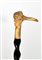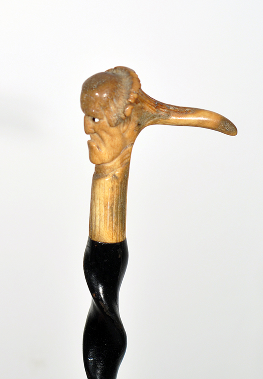 b) Bastone con impugnatura in corno di cervo a foggia di figura maschile grottesca; fusto in noce nero intagliata a "Tourchon"; Francia f.'800.