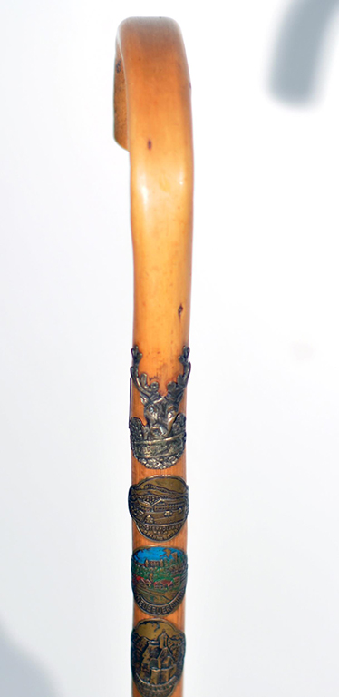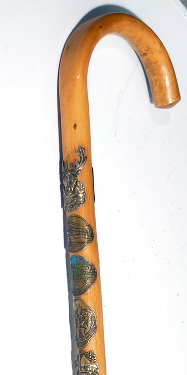 b)Bastone da montagna con applicata le targhette “ricordo” dei luoghi raggiunti dall’escursionista