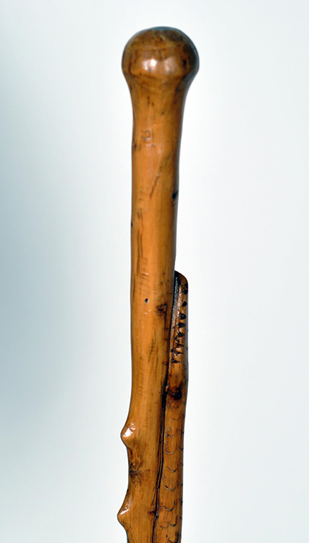 Fusto interamente realizzato con vertebre di coccodrillo annerite; impugnatura a pennacchio costituto da un unico osso di coccodrillo; puntale in ferro