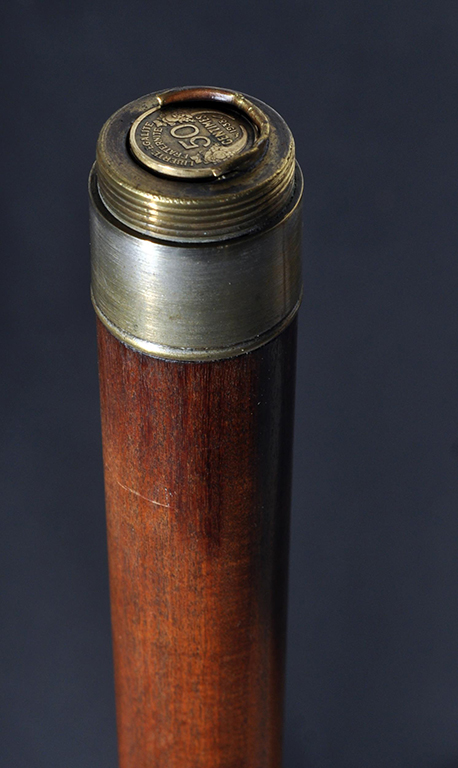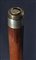 a) Bastone da viaggiatore in noce con puntale in ferro per bloccare le porte dall'interno con inciso "Contr" su anello a ruota dentata svitabile che nasconde un portamonete a molla per i 50 cent francesi