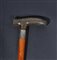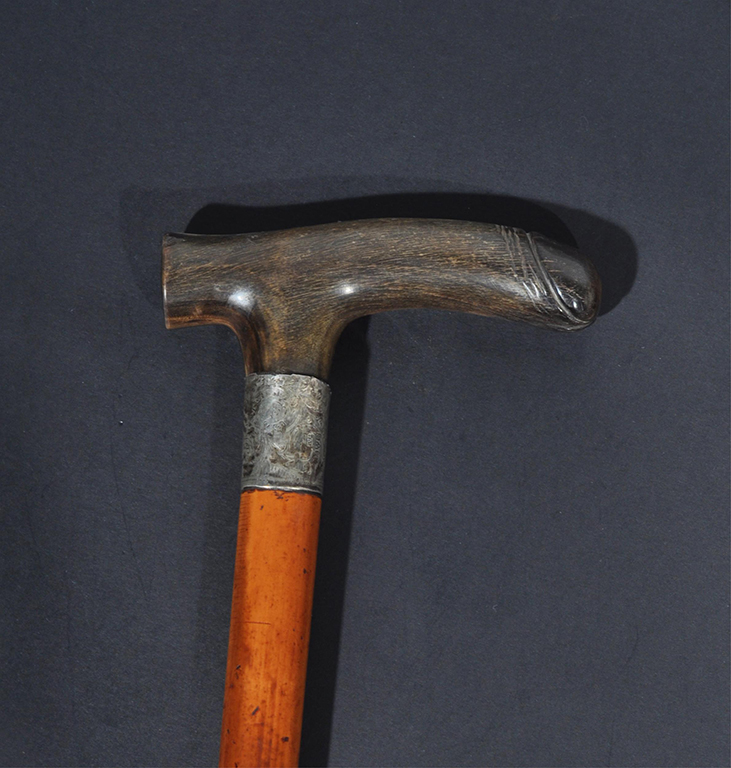 b) Bastone con fusto in malacca, ghiera in argento ed impugnatura in corno a forma di fallo.