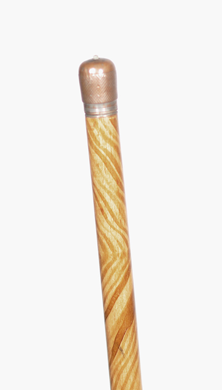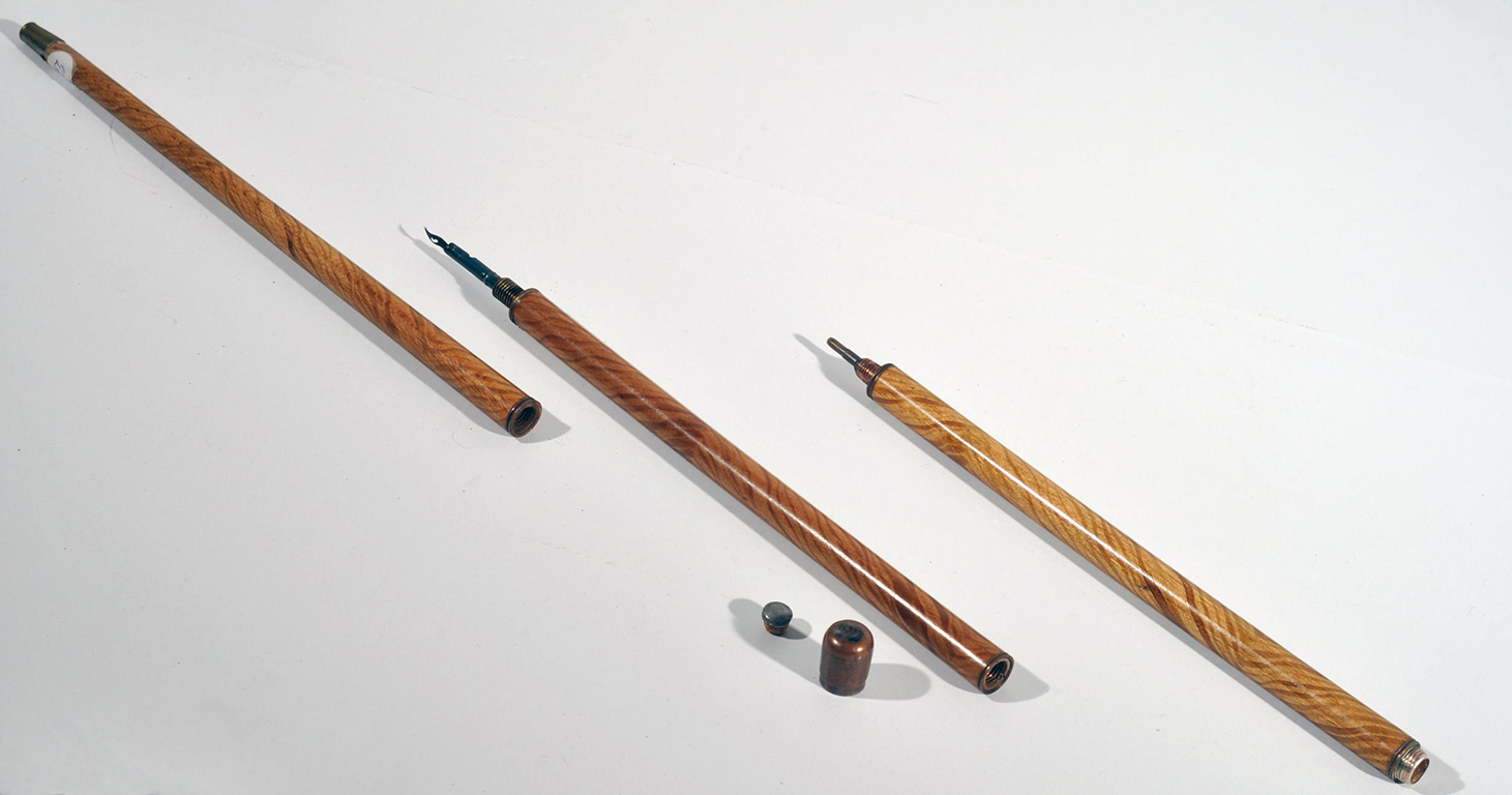 Bastone in legno striato a tre sezioni contenente strumenti per la scrittura: pennino e porta mine oltre al calamaio inserito nel manico a pomolo di metallo a fili intrecciati; puntale in ferro