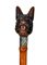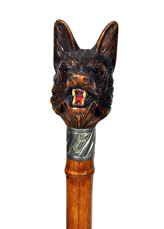 Bastone animato con ghiera alta incisa in diagonale e impugnatura in legno forgiata a testa di lupo con occhi di vetro. Dotato di due sistemi: randello in metallo retrattile a doppia spirale e lunga lama inserita nel fusto