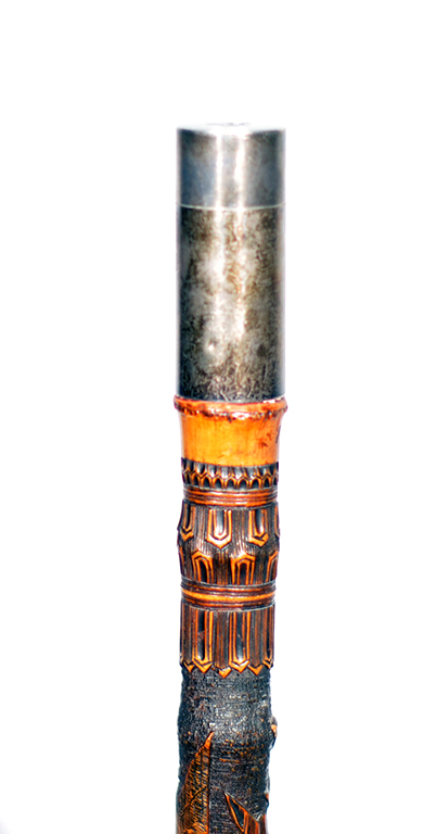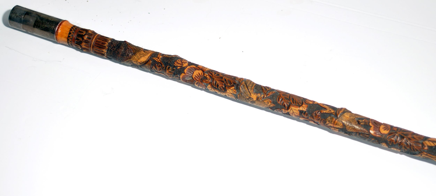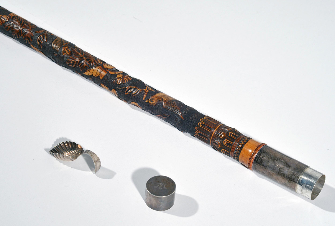Bastone con fusto interamente intagliato a impugnatura cilindrica in argento al cui interno si cela cucchiaio in argento per preparare thè.