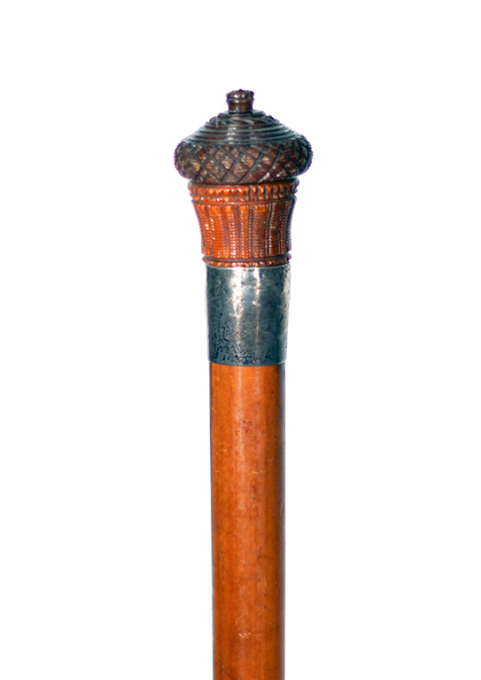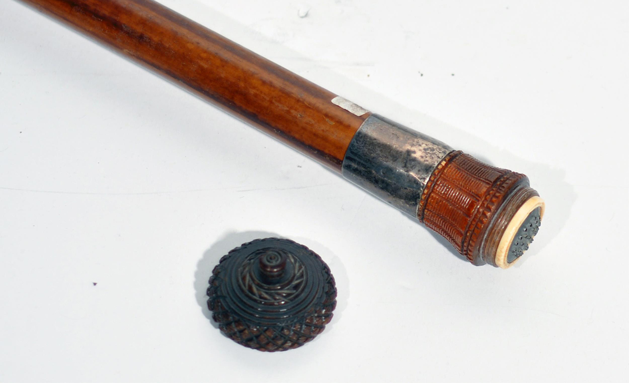 Bastone in legno con pomolo intarsiato che si svita, contenente un porta-sostanze odorose in metallo e avorio. Ghiera in argento