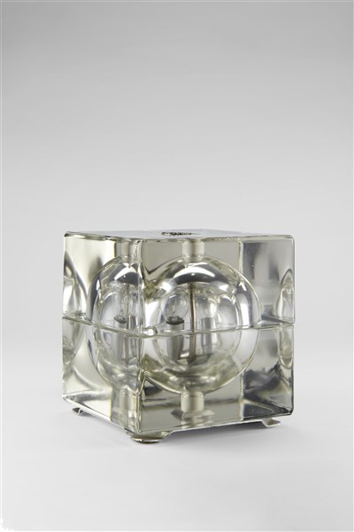 Lampada da tavolo modello "Cubosfera". Produzione Fidenza vetraria, Italia, 1968. Vetro stampato e metallo. (cm 16x16x16)