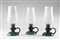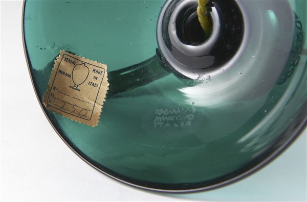 Tre lampade da tavolo della serie "Petroline". Venini, Murano, 1951-52ca. Base a calotta con manico in vetro trasparente verde, paralume in vetro lattimo. Disegno n. 2750 del catalogo Rosso. Firmate all'acido "venini murano ITALIA" e recante etichetta cartacea originale della manifattura. (h cm 32)