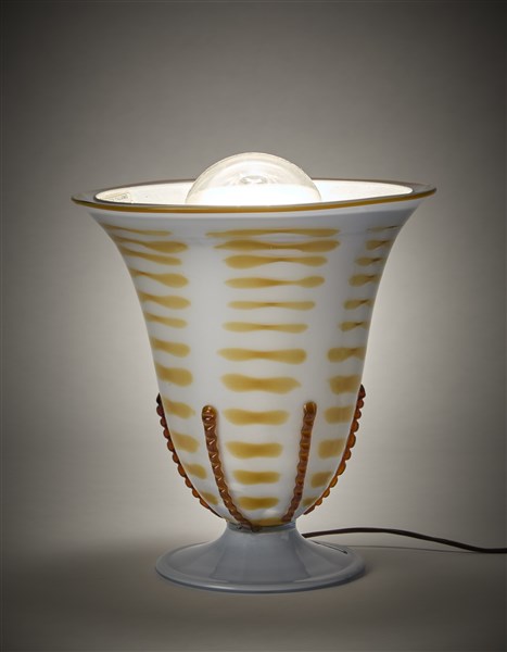 Vaso montato a lampada. Murano, anni '30. Vetro soffiato lattimo con morise in vetro trasparente ambra applicate a caldo, orlo superiore e macchie orizzontali parallele in vetro pagliesco. (h cm 34; d cm 32) (difetti)