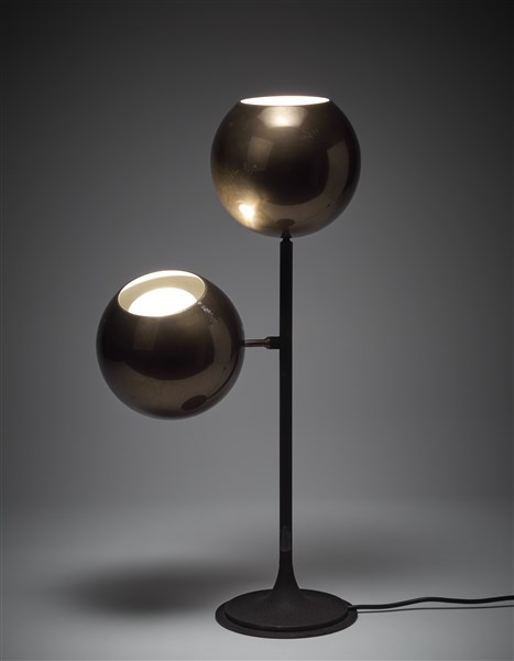 Lampada da tavolo modello "521". Produzione Arteluce, Milano, 1961. Riflettori a sfera in alluminio ossidato e bronzato, sfera inferiore orientabile, stelo in ottone e base in ghisa laccati marrone scuro craquelé. (h cm 71) (lievi difetti)