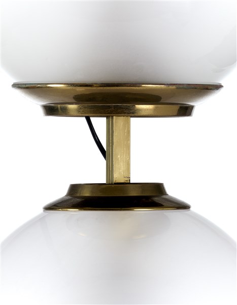 Lampada da terra modello "LTE 10 doppio pallone". Produzione Azucena, Milano, 1958. Base ottagonale in granito nero e bianco, asta e piattelli in ottone cromato, globi diffusori in vetro soffiato acidato sulla superficie interna. (h cm 222) (lievi difetti e piccole mancanze)