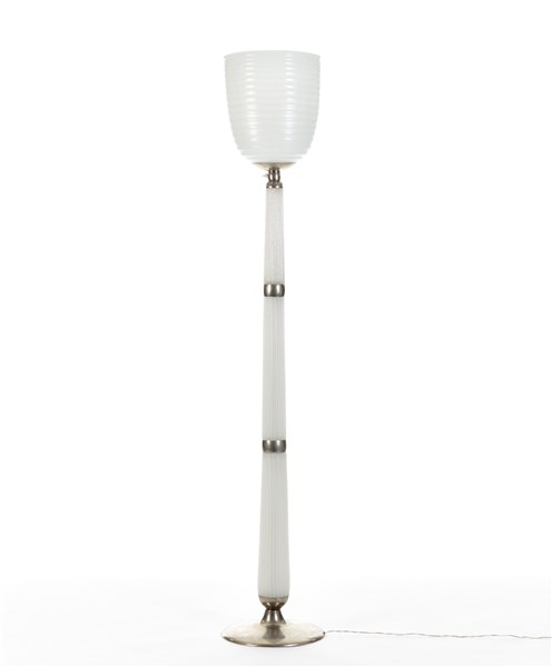 Lampada da terra. Murano, anni '30. Fusto e paralume in vetro pulegoso incolore costolato, base e ghiere di raccordo in ottone nichelato. Disegni di fornace n. 502 EV, 502 del Catalogo Blu, 2224 del Catalogo Rosso. (h cm 188) (lievi difetti)
