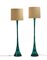 Two floor lamps. Execution by Venini, Murano, 1951ca. Shaft composed of seven overlapping truncated conical elements of transparent green blown glass. Furnace drawing no. 2242. Non-coeval beige fabric lampshades. (h 145 cm.)