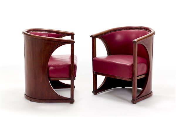 Coppia di poltrone a pozzetto della serie "428". Austria, anni '10. Struttura in legno di faggio massello e compensato curvato a vapore. Seduta e schienale rivestiti in cuoio bordeaux non originale. (cm 63x78,5x63,5) (lievi difetti)
