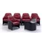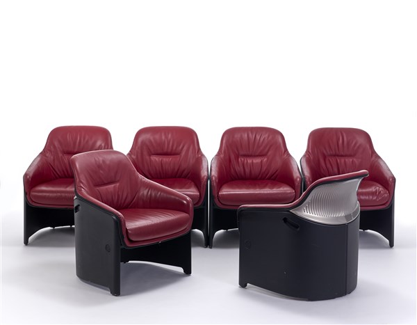 Gruppo di sei poltrone modello "Avus". Produzione Plank, Italia, 2013. Struttura in ABS, seduta e schienale imbottiti in pelle rossa. Marcate e datate. (cm 71x80x75)