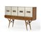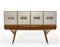 Credenza. Cantù, anni '50. Legno di mogano massello impiallacciato e bordato a quattro ante rivestite in similpelle con riquadri centrali decorati da dipinti su vetro e quattro cassetti alla base. Gambe in legno massello sagomate a forcella e puntone collegate da controventi in fusione di ottone. Recante etichetta della produzione "Palazzi dell'Arte, Cantù". (cm 229,5x143x48) (lievi difetti)