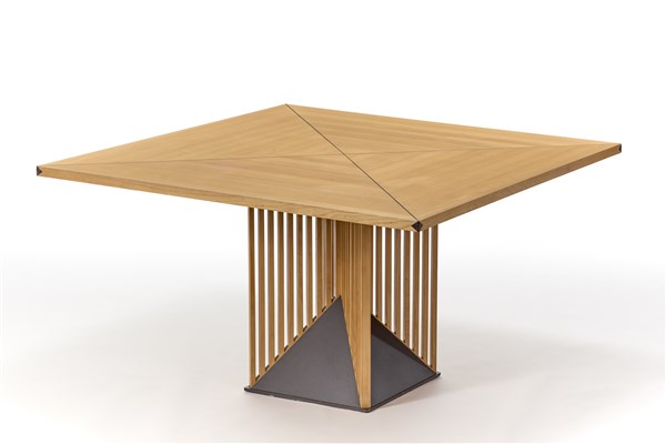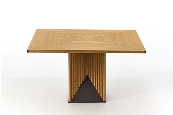 Variant table of the model "Maestro". Produced by Acerbis, Seriate (Bg), 1997ca. Top with parallel ash wood slats, divided by diagonal inlays in dark gray painted wood. Structure of solid ash wood, pyramidal base of dark gray painted wood. (130x76x130 cm.) (slight defects)