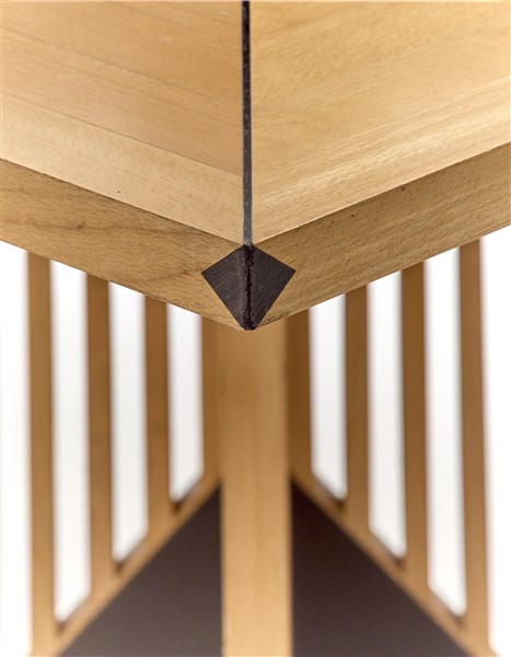 Tavolo variante del modello "Maestro". Produzione Acerbis, Seriate (BG), 1997ca. Piano a listelli paralleli di frassino, divisi da intarsi diagonali in legno verniciato grigio scuro. Struttura a listelli verticali paralleli in legno di frassino massello, base piramidale in legno verniciato grigio scuro. Zavorra nella base. (cm 130x76x130) (lievi difetti)