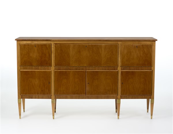 Credenza a tre ante a ribalta e quattro ante a perno in legno massello e impiallacciato, fasce orizzontali grissinate. Gambe a tronco di piramide rovesciato, guarnizioni e piedini in ottone. Esecuzione S.A.F.F.A. Milano, anni '50. (cm 200x117x47) (lievi difetti e restauri)