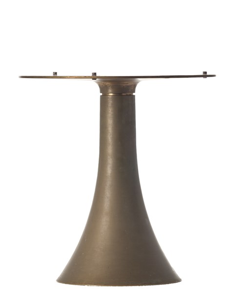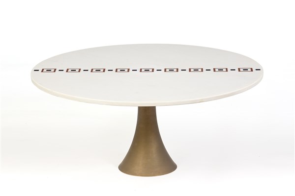 Coffee table. Produced by Bernini, Milan, 1961ca. Turned cast bronze base, white marble top with square black and brown marble inlays. (h 36 cm.; d 80 cm.) (slight defects)