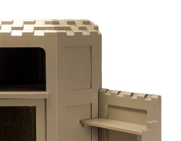Mobile Déco ad angolo in tre parti asimmetriche con ripiani a giorno e settore centrale ad ante. Milano, 1925ca. Legno massello verniciato beige, vetro, midollino. (cm 184x212x60) (lievi difetti)