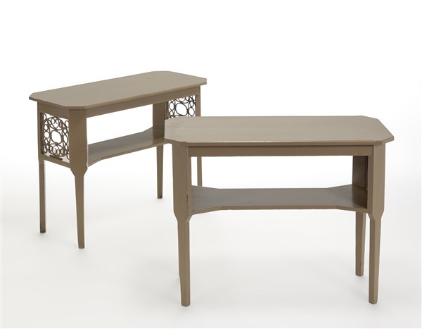 Coppia di consolle Déco a due ripiani. Milano, 1925ca. Legno massello verniciato beige, decori laterali geometrici in midollino intrecciato. (cm 108x80x50) (lievi difetti)