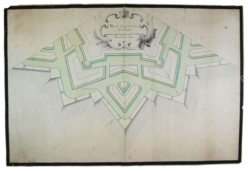Sébastien Vauban Le Prestre (de) (1633-1707) e altri. Pianta del Bastione di Briançon. 1721. Penna e inchiostro nero, acquerelli colore verde rosso e grigio. Foglio: mm 560x830. In alto a destra la data manoscritta a penna "1721". Il disegno rappresenta una pianta dell'impenetrabile Forte di Briançon una delle opere dell'ingegnere della corte di Luigi XIV Sébastien Vauban che a partire dal 1678 divenne Commissaire Général des Fortifications du Royaume. L'opera architettonica, che occupa una posizione strategica all'intersezione di 5 valli ed è resa spettacolare dall'acuto bastione che s'incunea nello sperone di roccia a 1326 metri di altezza, fu terminata dopo la morte del suo autore ma seguendo fedelmente i suoi disegni. Il disegno, inquadrato da due linee di cornice a pennello e inchiostro acquerellato nero, è perfettamente godibile nonostante un leggero ingiallimento diffuso. Alcuni piccoli strappi lungo la piega longitudinale, agli angoli e lungo i bordi.