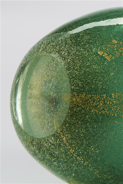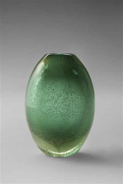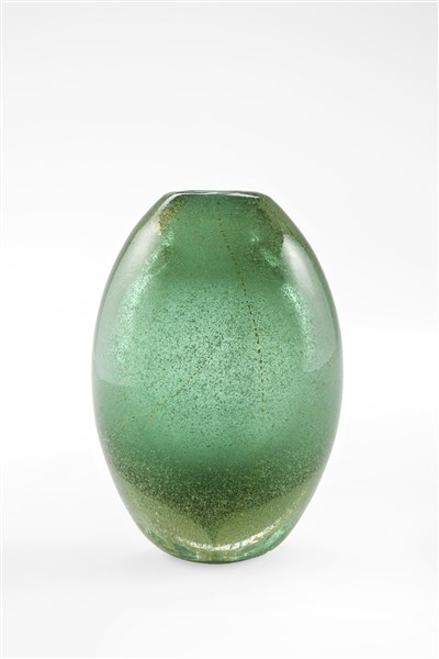 Vaso ovoidale della serie "Sommersi". Esecuzione Venini, Murano, 1934-36ca. Vetro sommerso verde con inclusione di foglia d'oro. Disegno n. 3596 del catalogo Blu. Firmato all'acido "venini murano MADE IN ITALY". (h cm 13)