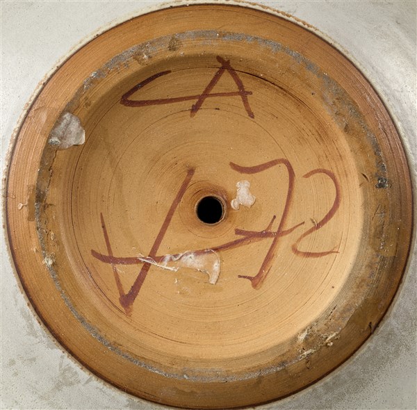 White/grey glazed terracotta spherical sculpture. Manufacture of Ceramiche Arcore, Italy, 1972. Signed and dated under the base "CAV '72". (d 37 cm.) (slight defects)
