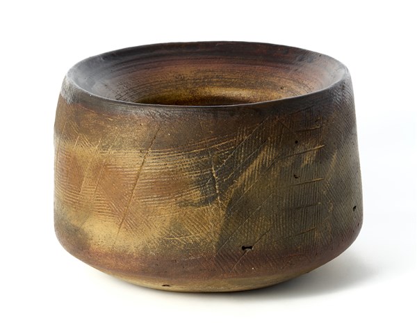 Scultura vaso in terracotta graffita e colorata nei toni del bruno. Italia, 1960. Monogrammato "VA" sotto la base e datato '60. (h cm 26; d cm 38)