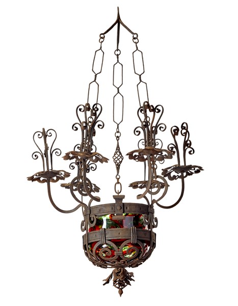 Six-light cesendello chandelier in wrought iron and embossed iron sheet, including a transparent blown glass vase with green, red and amethyst filaments on a colorless background. Execution by Vetreria Artistica Barovier, Venice/Murano, 1920s. (h 125 cm.; d 74 cm.) (slight defects, small professional conservative restoration)