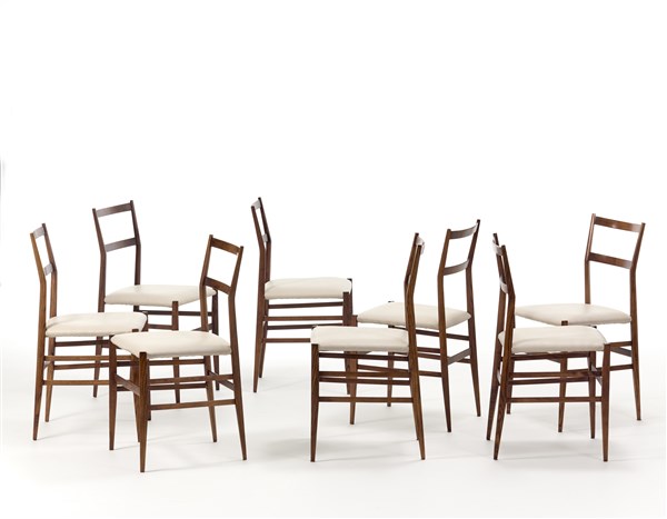 Otto sedie modello "Superleggera". Produzione Cassina, Meda, disegno del 1957, esemplari del 1964/1965. Legno di frassino, seduta rivestita in similpelle bianca"Il putto con il vaso"