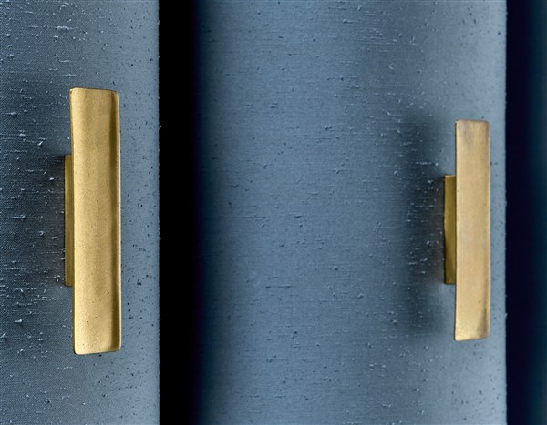 Hanging entrance wardrobe composed of three revolving cylindrical bodies. Produced by Paleari e Figli, Lissone, 1950s. Cylinder frame made of wood covered on the outside with sugar paper-colored fabric, on the inside with white satin. Brass handles and hangers, cast brass lower brackets with pivot, cast brass upper brackets, thick "Securit" ground crystal shelf. Wall-mounting substructure of painted steel, not coeval. (118x175x45 cm.) (slight defects and restoration)