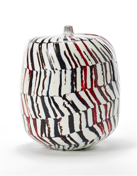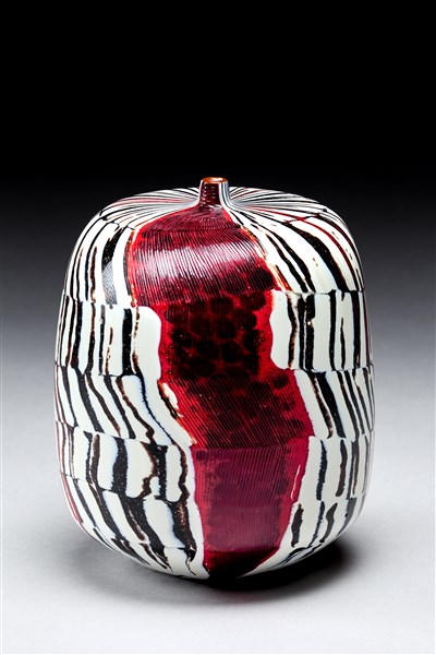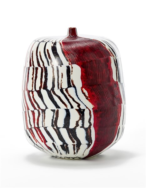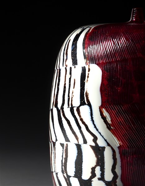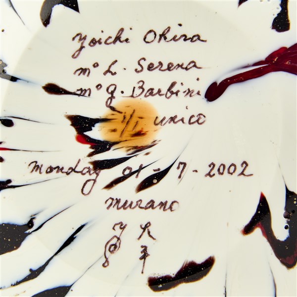 Vaso cilindriforme con colletto troncoconico. Esecuzione Livio Serena e Giacomo Barbini, Murano, 2002. Vetro soffiato a fasce lattimo con inserti in polveri nere e rosse opache, fascia in vetro rosso trasparente incisa alla piccola mola con lievi scanalature parallele. Orlo in pasta vitrea rossa. Pezzo unico. Firmato e datato a punta sotto la base "Yoichi Ohira, m° L. Serena, m° G. Barbini, 1/1 unico, Monday 01-7-2002, Murano", monogramma dell'artista. (h cm 20)