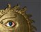 Letto matrimoniale della serie "Arte dell'abitare". Esecuzione Mirabili, Firenze, 1986ca. Testiera in legno sagomato, intagliato e dorato, a figurare un sole raggiante con occhio, ali, volute e simbolo dell'omega. Pediera in legno sagomato, intagliato e argentato. Occhio in metacrilato bianco e verde retroilluminato.
