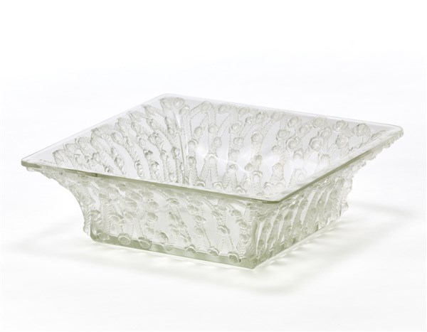 Coppa quadrata modello "Roses". Francia, anni '40/'50. Vetro soffiato in stampo leggermente acidato. Modello creato nel 1939, ripreso dopo il 1951. Firmato a punta alla base "Lalique France". (cm 24,5x8x24,5)