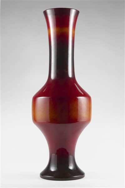 Large ceramic vase enamelled in shades of red brown, orange under showcase. Faenza, second half 20th century. Signed under the base. (h 65 cm.) (slight defects)