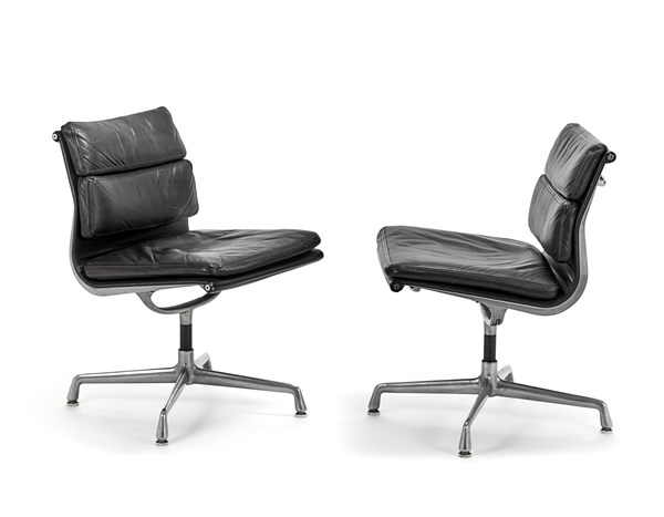 Coppia di sedie girevoli della serie "Aluminium Group". Produzione Herman Miller, USA, 1958ca. Struttura in alluminio pressofuso, seduta e schienale in pelle nera, piedini ammortizzati. Recanti etichetta adesiva del produttore. (cm 51,5x81x62) (lievi difetti)