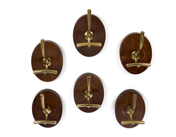 Lotto composto da sei appendiabiti. Produzione Azucena, Milano, anni '50. Ottone e legno. (cm 13,5x22) (difetti)