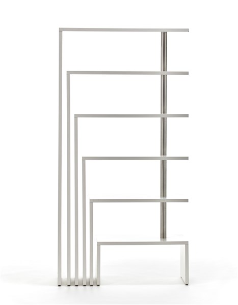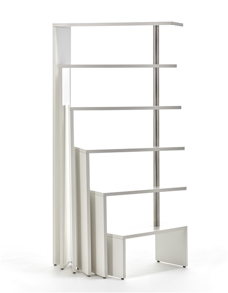 Libreria a ripiani rotanti autoportante modello "Joy". Produzione Zanotta, Nova Milanese, 1990. Medium density fiberboard verniciato bianco e acciaio. (cm 85x169x30,5) (lievi difetti)