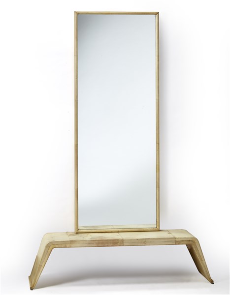 Specchio déco da appoggio con struttura in legno completamente rivestita in pergamena. Roma, 1939ca. (cm 120x178x22) (difetti)