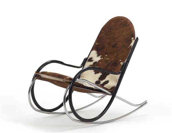Rocking chair model "Nonna". Produced by Strässle, Swiss, 1970s. Black painted curved wood and chromed steel tubular. Pony skin seat. (54x89x95 cm.)(defects)