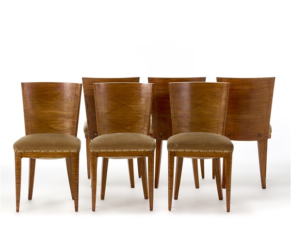 Gruppo di sei sedie Novecento in legno impiallacciato, seduta imbottita e rives