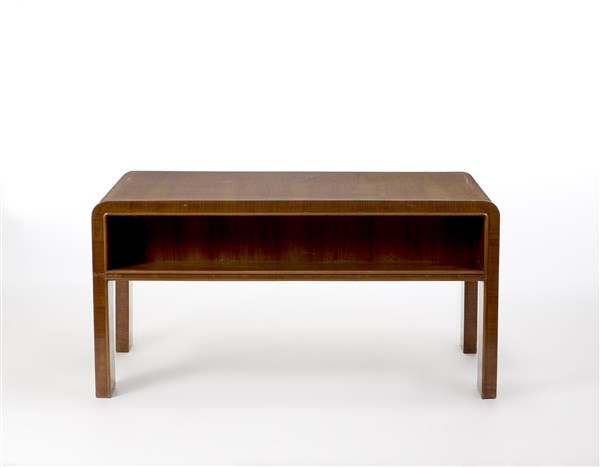 Novecento wood veneered five-drawer center desk, crystal top, nickel-plated metal handles. Italy, 1930s. (160.5x81x90.5 cm.) (defects)