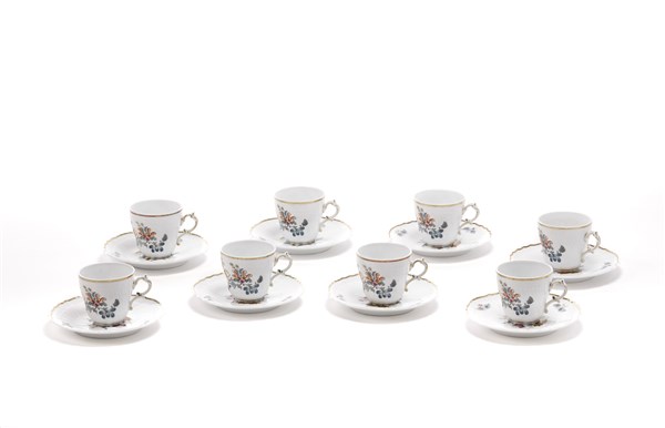 Servizio da caffè composto da otto tazzine con piattini, in porcellana dipinta in policromia a motivi floreali. Milano, anni '30. Marcate sotto la base.