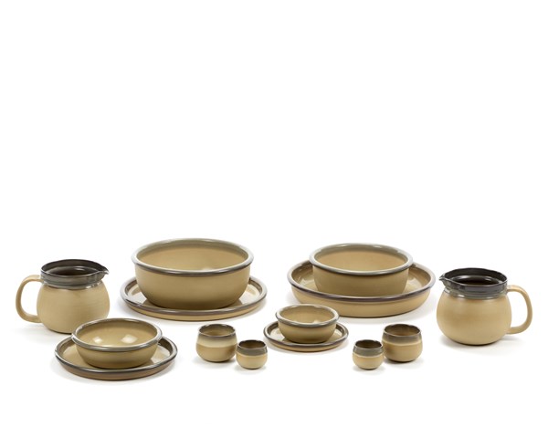 Lot consisting of twenty-four flat plates, twelve soup plates, twelve small bowls, twelve sie plates, twelve cups, twelve saucers, three serving dishes, two salad bowls, and two pitchers. Manufacture of Ceramiche Arcore, Arcore, 1980s. Brown stoneware. Marked under the base.