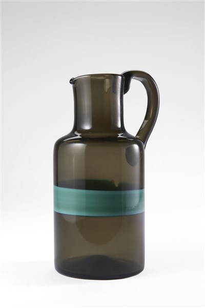 Jug model "976/28". Murano, 1950s. Clear gray blown glass with opaque teal glass band. Signed "venini murano ITALIA". (h 28.5 cm.)