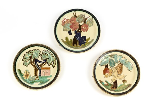 Giovanni Gariboldi Tre piatti in terraglia smaltata in policromia e graffita a m
