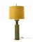 Table lamp. Milan, 1950s. Green incamiciato glass shaft, polished brass base, cardboard and yellow fabric original lampshade. Maker's mark on the jack. (h 79.5 cm.) (defects)