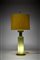 Lampada da tavolo. Milano, anni '50. Fusto in vetro incamiciato verde, base in ottone lucidato, paralume originale in cartoncino e tessuto giallo. Recante marchio del produttore sullo spinotto. (h cm 79,5) (difetti)